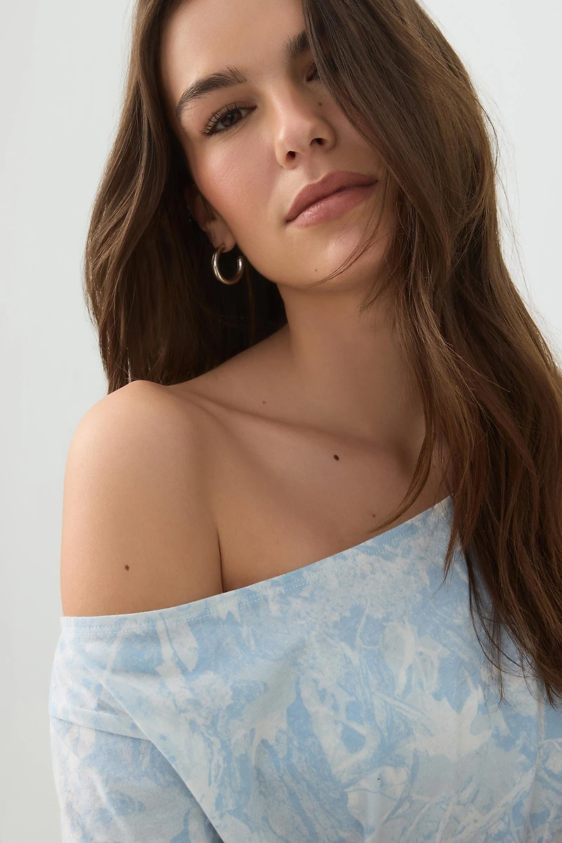 T-shirt à épaule dénudée camouflage bleu