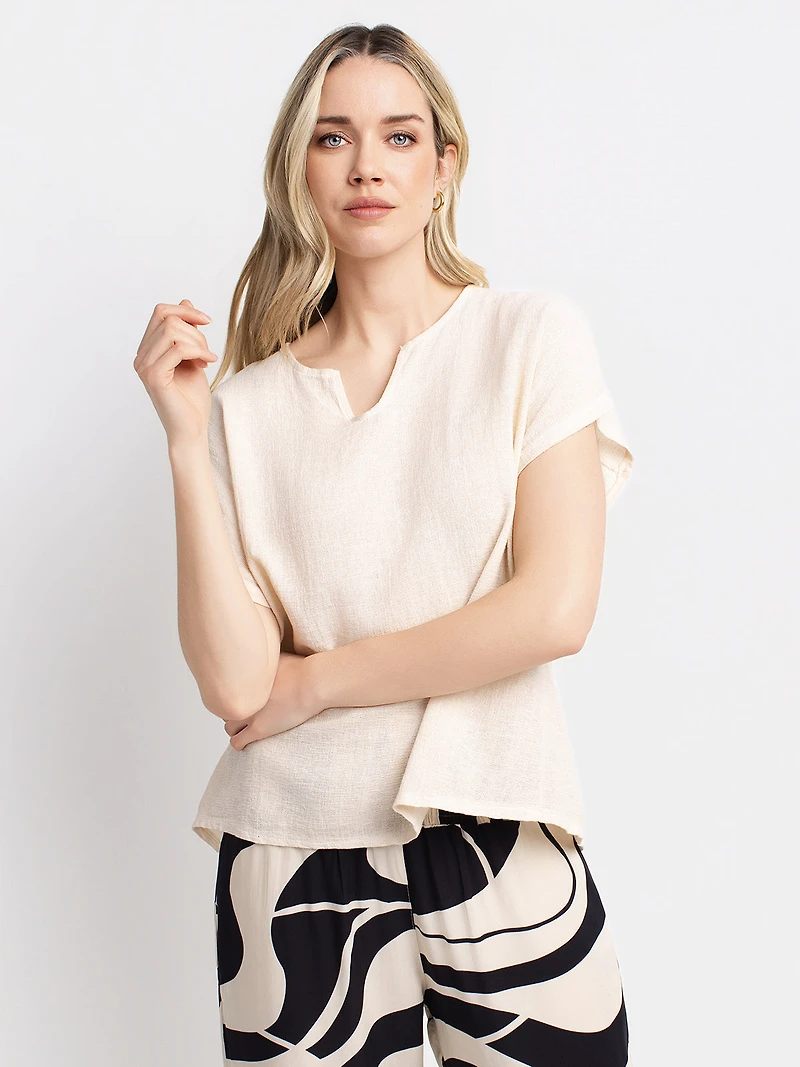 T-shirt à manches courtes avec coupe droite réalisé dans un tissu à texture légère. Le modèle comporte une encolure ronde avec encoche en V, des manches courtes avec revers et un empiècement au dos avec pli central.