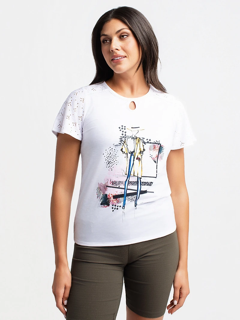 T-shirt à manches courtes avec encolure ronde et petite ouverture en forme de goutte au centre du devant. Les manches présentent un empiècement en tissu ajouré avec motif perforé. Le buste est orné d’un imprimé représentant une silhouette stylisée à l'avant.