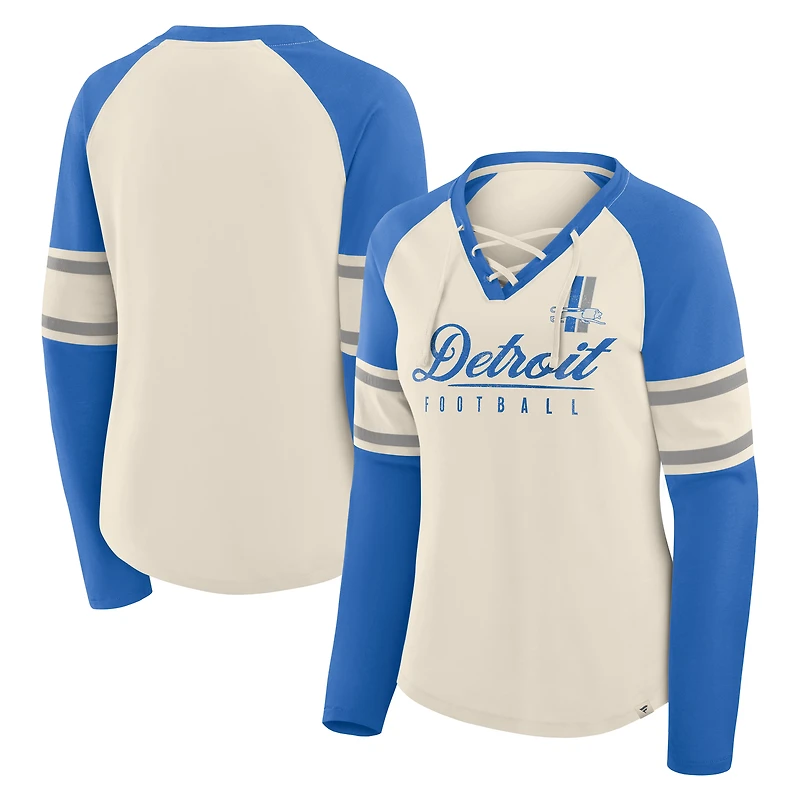 T-shirt à manches longues et col en V lacets pour femme Fanatics crème/bleu Detroit Lions Hometown Gridiron Hero