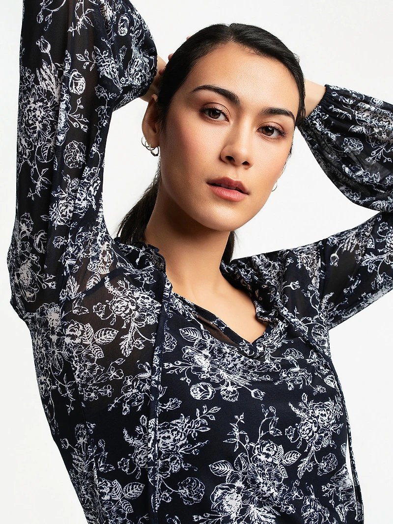 Haut à manches longues en tissu tissé léger avec imprimé floral contrasté sur fond sombre. Il présente une encolure en V avec liens et des poignets élastiqués.