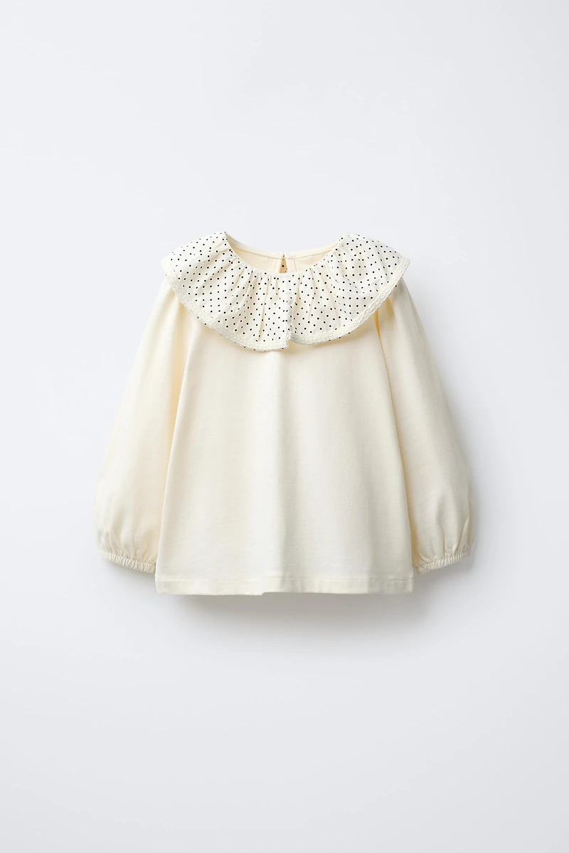 Haut avec col claudine, détails brodés et manches longues à poignets élastiques. Fermeture avec bouton goutte d'eau dans le dos. Tissu 100% coton.