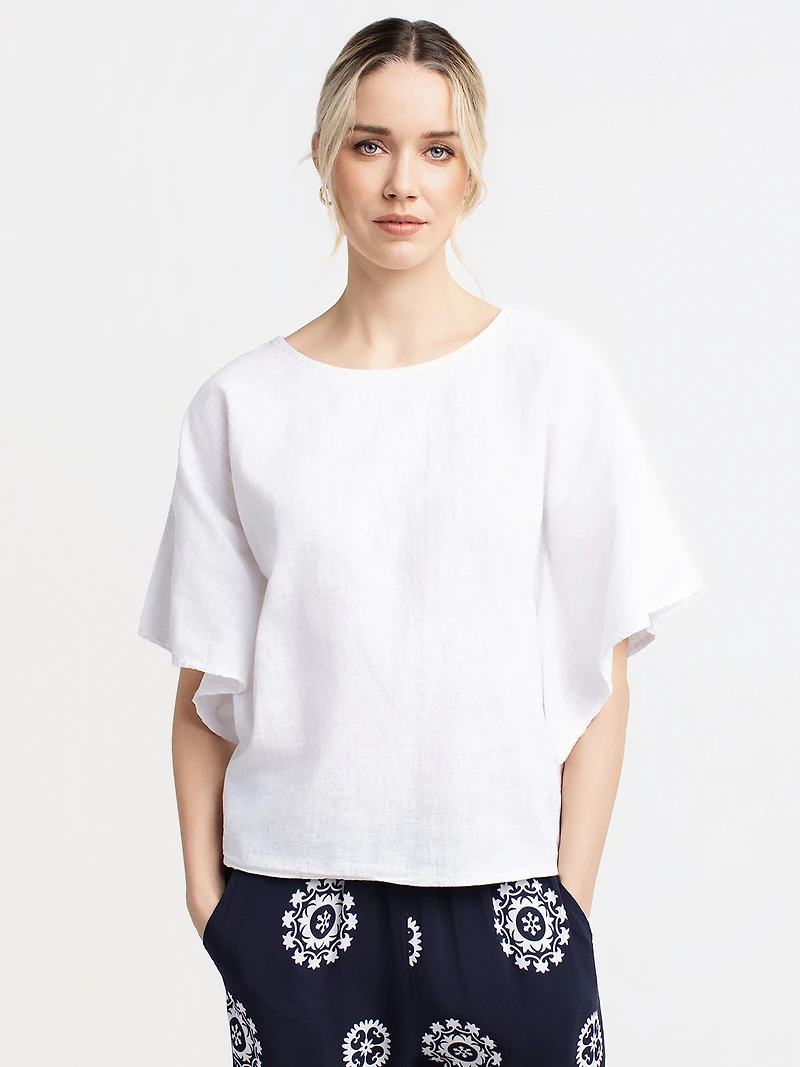 T-shirt à coupe droite avec manches courtes évasées et encolure arrondie. La partie arrière est structurée par un empiècement central vertical en textile à surface structurée avec lignes horizontales.