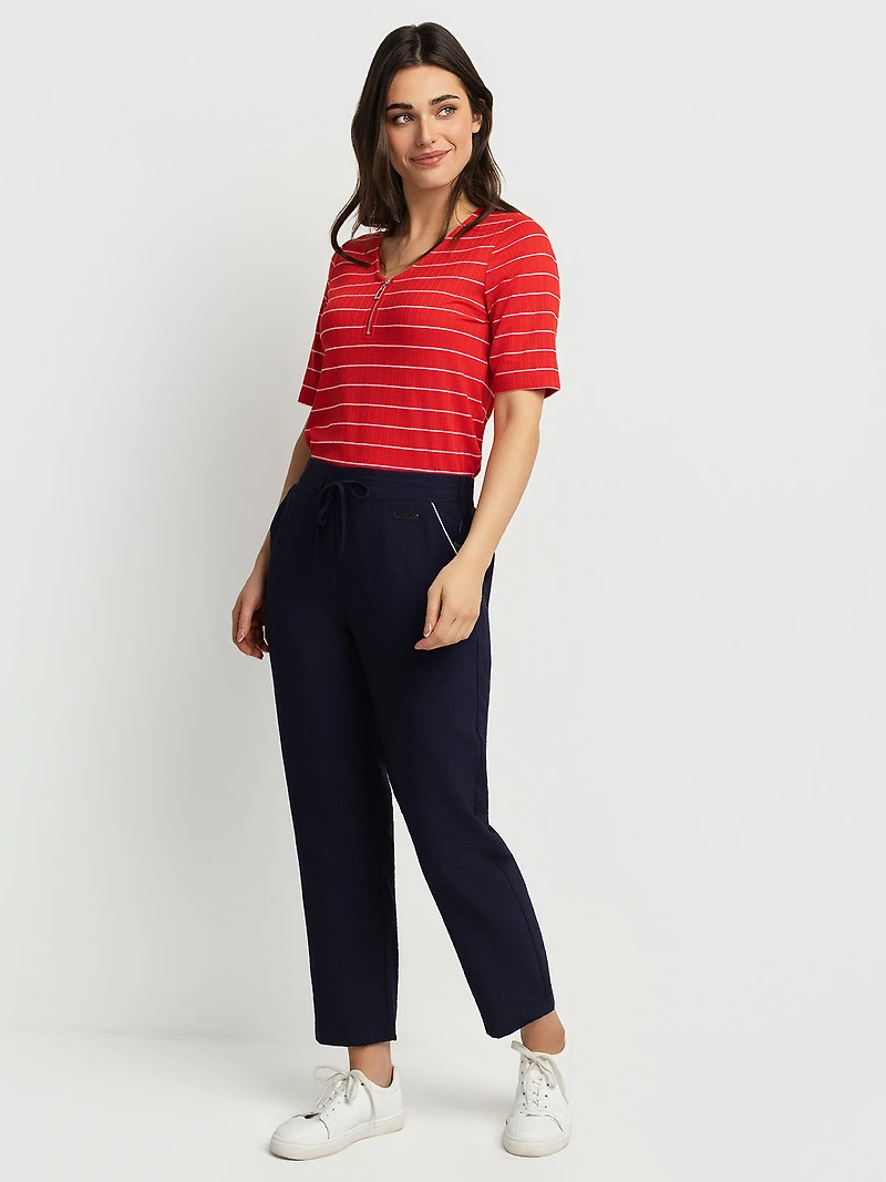T-shirt à manches courtes en tissu tricoté, avec col en V zippé et coupe droite. Il présente un motif à fines rayures horizontales contrastées.