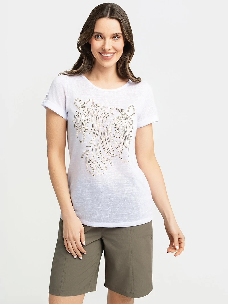 T-shirt semi-ajusté à manches courtes en textile tricoté fin de couleur unie. Il présente une encolure arrondie, des manches montées courtes et un motif décoratif brillant appliqué sur le devant.
