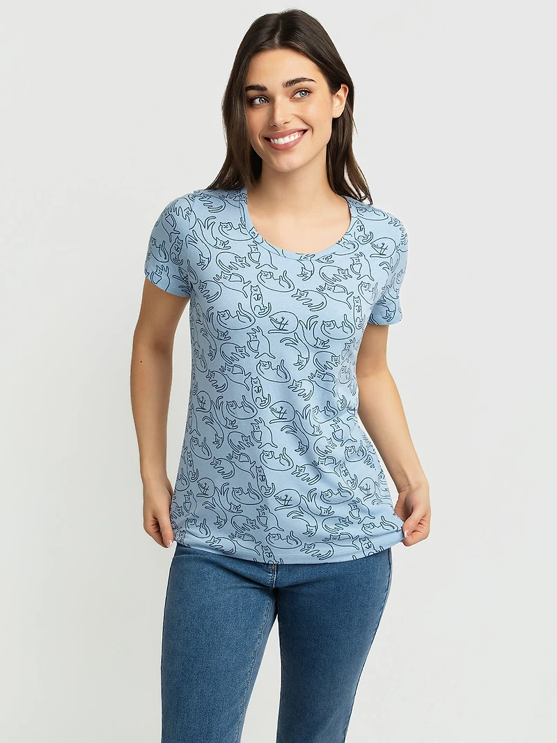 T-shirt semi-ajusté à manches courtes en textile extensible imprimé, avec encolure ronde. Le modèle présente un motif répété de chats sur toute la surface.