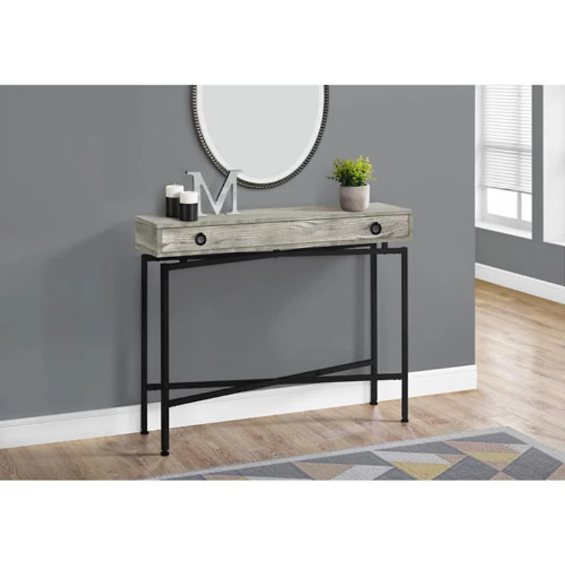 Grand tiroir idéal pour ranger des télécommandes, des chargeurs, des clés et d'autres articles que vous voulez dissimuler, mais garder à portée de main Style contemporain avec l'allure tendance du bois récupéré et de la quincaillerie noire moderne Construction durable en panneaux de particules stratifiés avec base en métal Fini de bois récupéré gris pouvant s'agencer facilement à votre décor actuel Assemblage requis Dimensions : Largeur : 107,95 cm (42,5 po); hauteur : 82,55 cm (32,5 po); Profondeur : 30,48 cm (12 po)