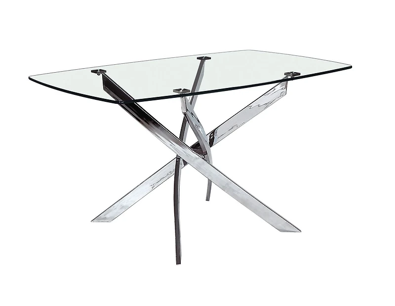 Une table de salle à manger élégante qui s'intègre à n'importe quel décor. Support robuste d'une base moderne. Quatre pattes torsadées en acier poli. Dessus en verre trempé rectangulaire.