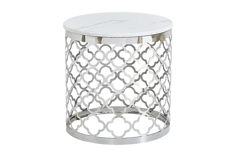 La table de bout Madina est un ajout étonnant qui allie beauté et fonctionnalité dans votre maison. Le plateau rond est fabriqué en faux marbre de Carrera qui est superposé au-dessus de la pierre véritable, ce qui lui confère l'aspect et le poids du vrai marbre. Le plateau est recouvert d'un stratifié brillant qui ajoute à l'effet marbre lustré et rend la table facile à nettoyer. La base cylindrique en acier inoxydable, avec une finition chromée brillante, présente un motif quadrilobé perforé qui, associé au blanc et à l'argent brillant, donne à votre pièce un aspect lumineux et ouvert.