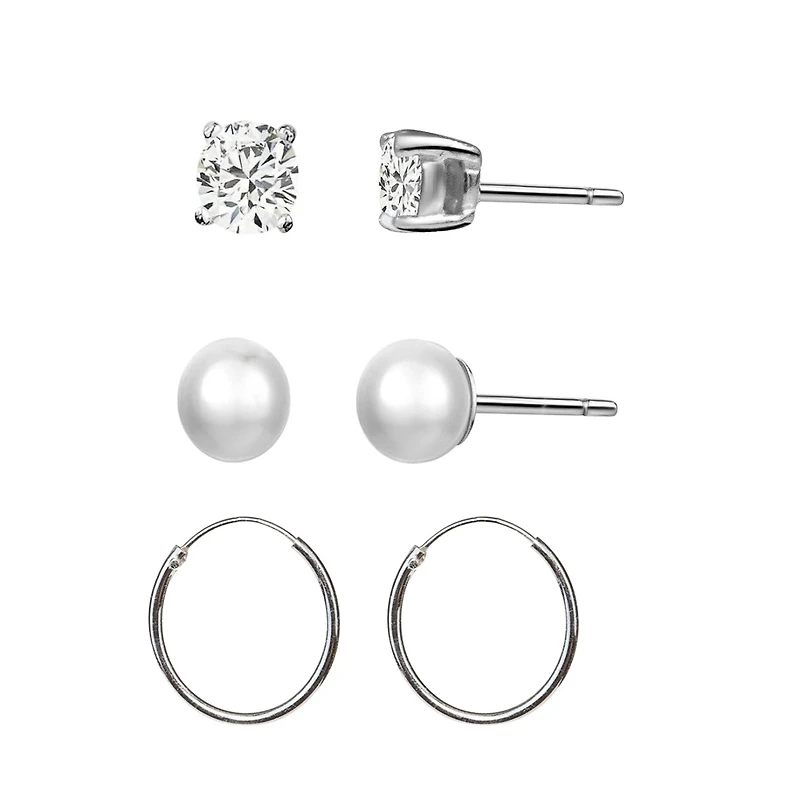Trio boucles d'reille pour femme.925+cz, perle véritable. Color: blanc | Doucet Latendresse