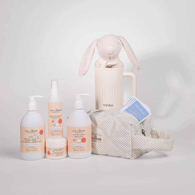 - En exclusivité : • Trousse à cosmétiques Bleu Lavande • Hochet de l’entreprise québécoise Clément • Tasse de bain Minika • 4 billets d’entrée pour visiter les champs de lavande cet été