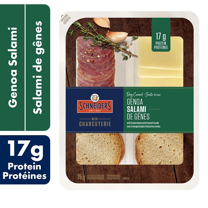 Offrez-vous une délicieuse collation avec la trousse-collation de salami de Gênes salé à sec Schneiders®. Avec 17 grammes de protéines par trousse, cette collation pratique à base de salami et de fromage vous permet de déguster facilement votre assiette de charcuterie personnelle sur le pouce, et c'est un excellent choix à conserver au réfrigérateur à la maison ou au bureau pour une gâterie de fin d'après-midi. Le salami de Gênes est séché jusqu'à 18 jours pour lui donner une saveur relevée et il se marie parfaitement avec le gouda en tranches et les craquelins. Depuis 1890, la marque Schneiders® a établi un riche patrimoine de recettes originales et authentiques, utilisant des ingrédients de première qualité et prenant tout le temps nécessaire pour honorer l'origine et l'inspiration de chaque recette. La qualité n'a pas d'âge.