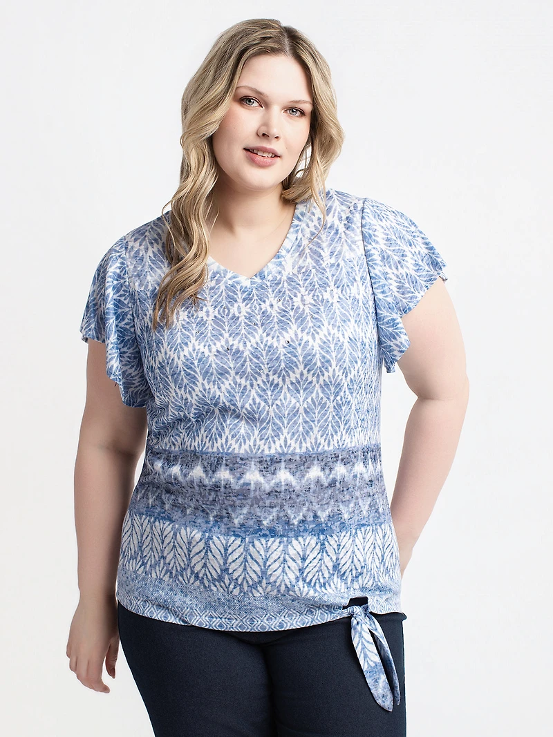 T-shirt avec encolure en V et manches courtes à forme évasée. Le modèle présente un lien à nouer intégré sur le côté inférieur et un motif imprimé végétal réparti en bandes horizontales.
