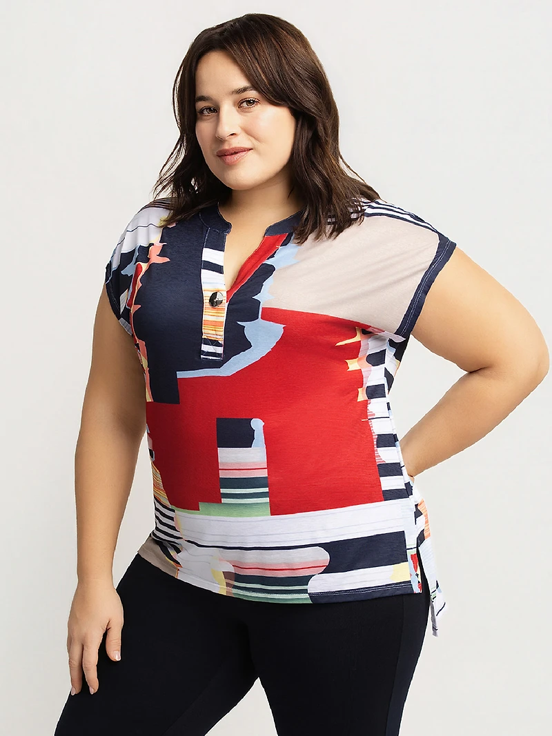 Haut à manches courtes en tissu tricoté avec impression graphique multicolore. Il présente une encolure tunisienne avec patte boutonnée courte, une coupe droite et une longueur aux hanches.