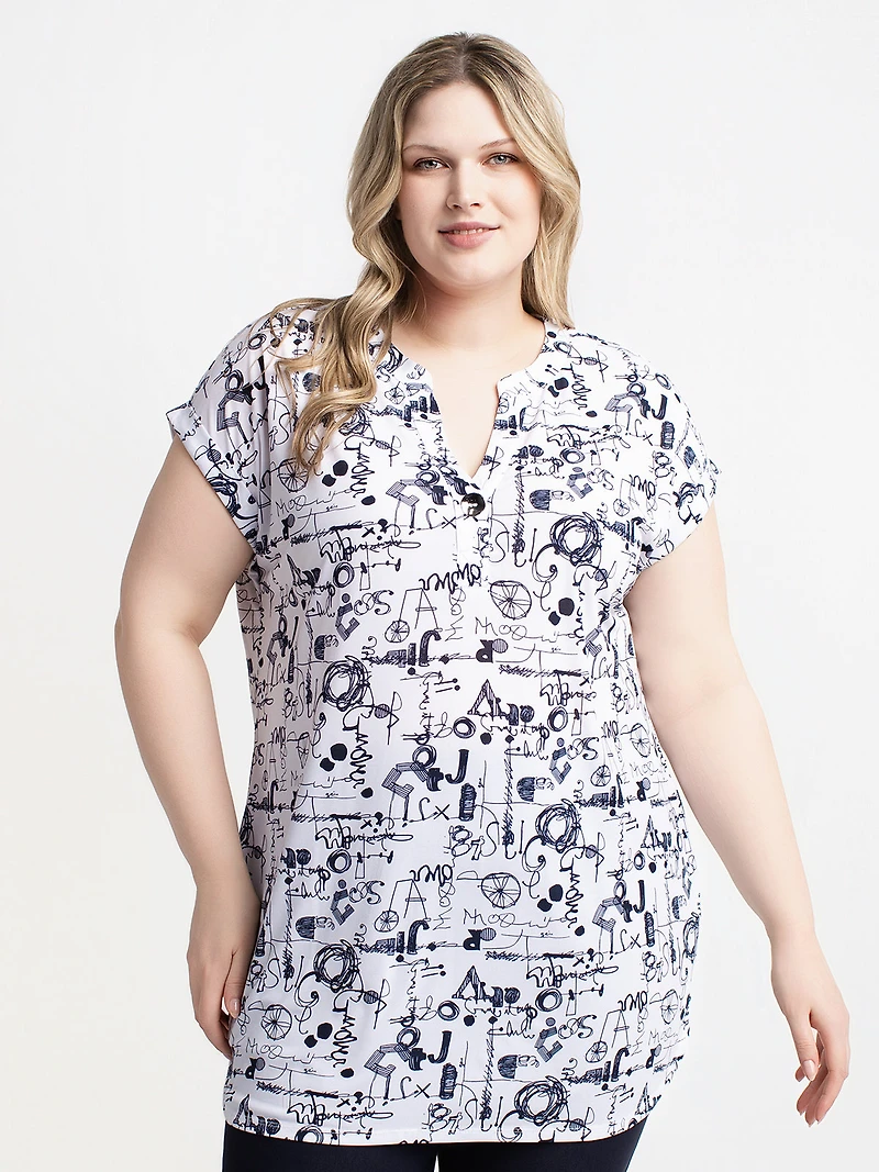 Tunique ample à manches courtes avec encolure en V et patte partielle décorative. Elle est réalisée en tissu tissé imprimé, avec un motif graphique sur l'ensemble du vêtement et une longueur couvrant le haut des hanches.