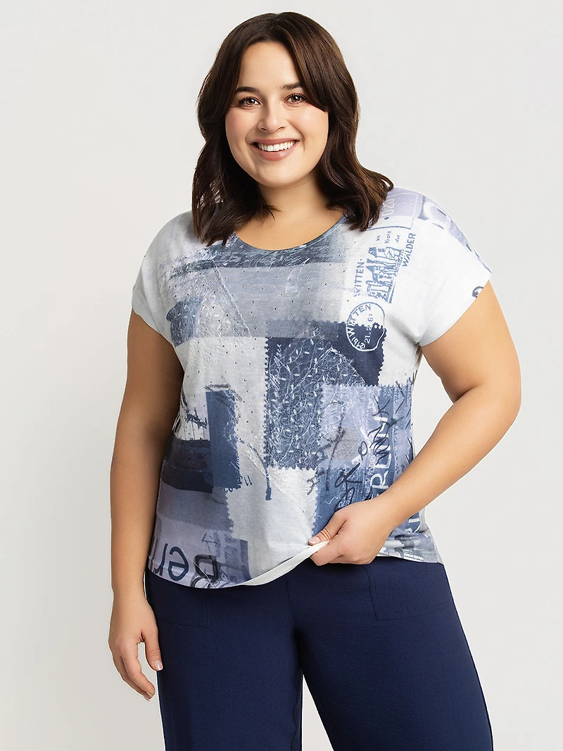 Haut à manches courtes en tissu tricoté avec impression graphique, comprenant des motifs textuels et abstraits. Il présente une encolure arrondie, une coupe droite et une longueur aux hanches.