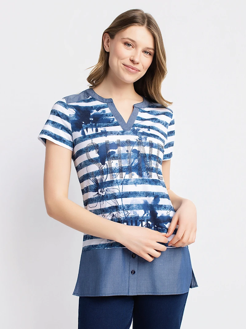 Tunique ample à manches courtes à coupe droite. Elle présente une encolure en V avec bande rapportée, ainsi qu’un motif à rayures horizontales, tandis que le devant est orné d’une impression avec le lettrage «Shine», accompagné de fleurs à effet dessiné au tracé.