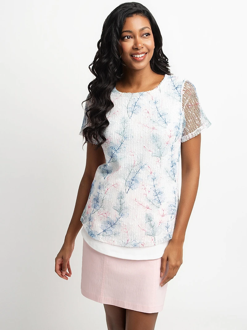 Haut à manches courtes en textile tissé à surface texturée, avec un motif imprimé multicolore réparti sur l’ensemble. Il présente une encolure arrondie, des manches en maille ajourée contrastée et une coupe droite.