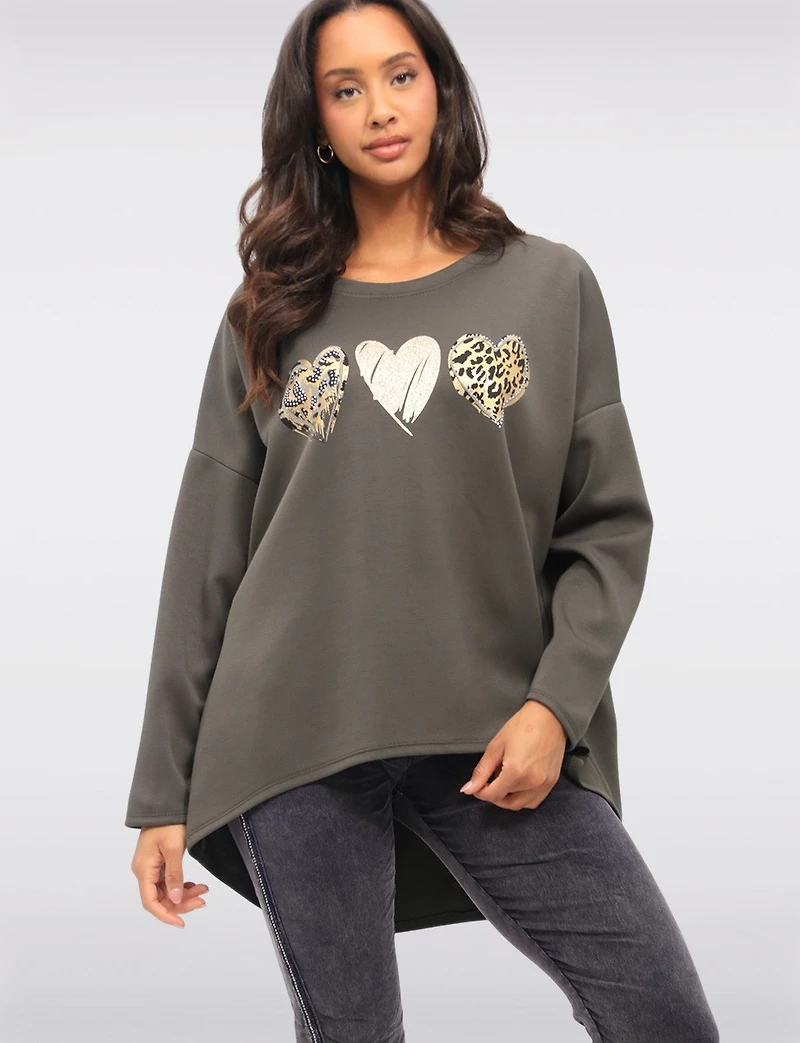 Découvrez la tunique douce de Froccella: coupe décontractée, cœurs dorés, strass, ourlet bas-haut, manches longues. Manteaux Manteaux