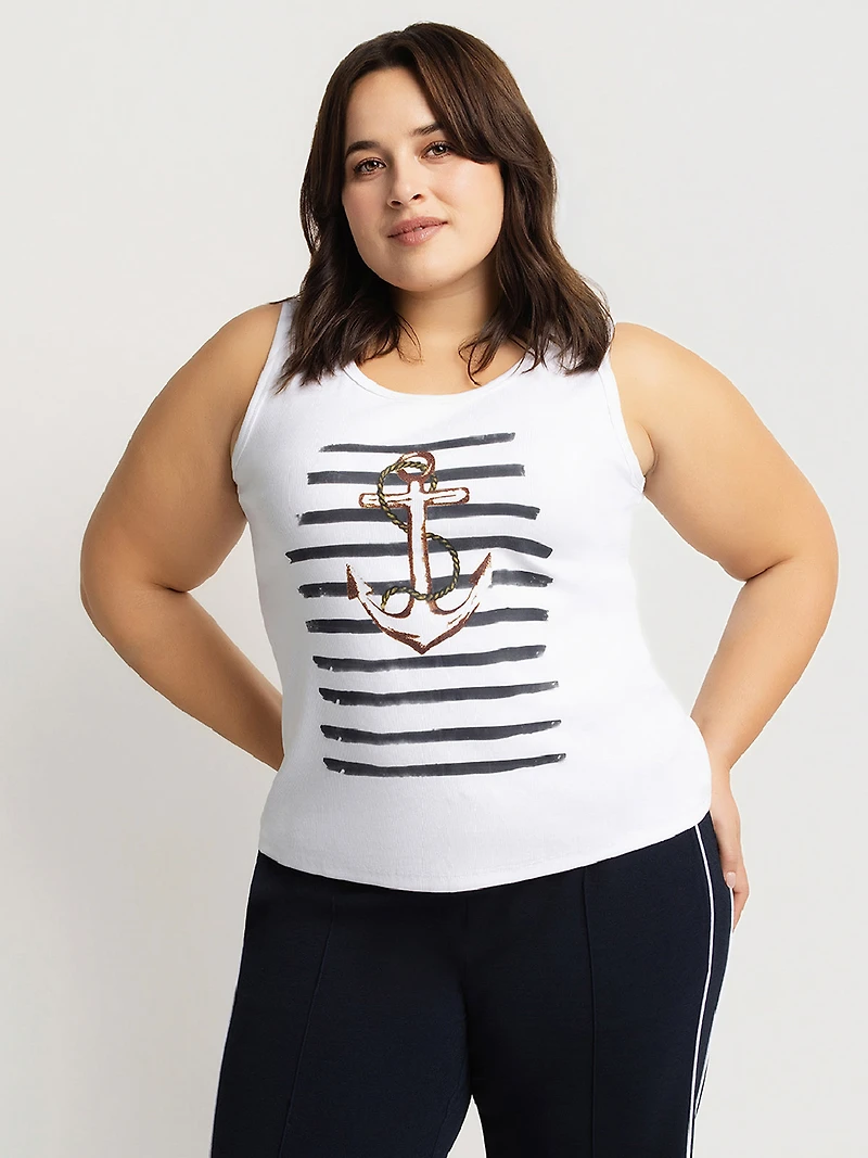 Camisole en tissu tricoté extensible uni, avec une encolure arrondie et des emmanchures dégagées. Le devant présente une impression graphique centrale combinant des rayures horizontales et un motif d’ancre, avec une longueur aux hanches.