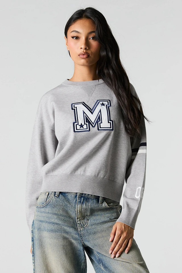 Twill Embroidered Striped Sleeve Knit Sweater