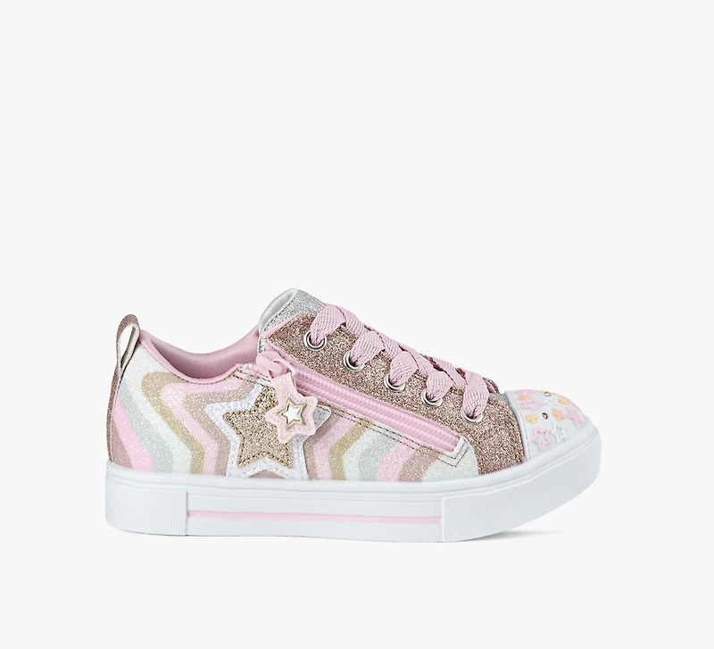 Brillez à chaque pas avec les Skechers Twinkle Toes: Twinkle Sparks – Cosmic Burst. Cette basket scintillante présente une tige en matière synthétique pailletée, un bout lumineux orné d’étoiles et une fermeture zippée latérale pour un enfilage facile. Avec ses faux lacets et sa semelle intérieure matelassée, elle allie confort et éclat tout au long de la journée—parfaite pour illuminer la pièce, littéralement.