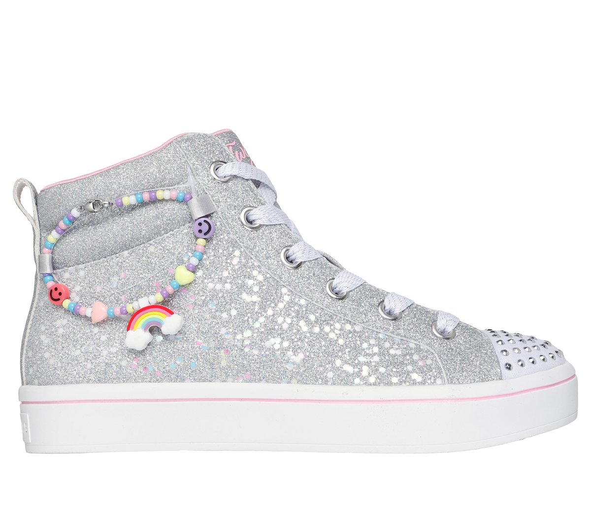 Formez une belle paire avec votre bout de chou en portant la chaussure Skechers Twinkle Toes® : HI-Lites - Charm Bestie. Cette chaussure végétalienne haute et à la mode pour adultes comprend des lacets, une empeigne en toile étincelante avec un embout orné de pierres Strass, une semelle intérieure Skechers Air-Cooled Memory Foam™, ainsi qu’une breloque amovible.
