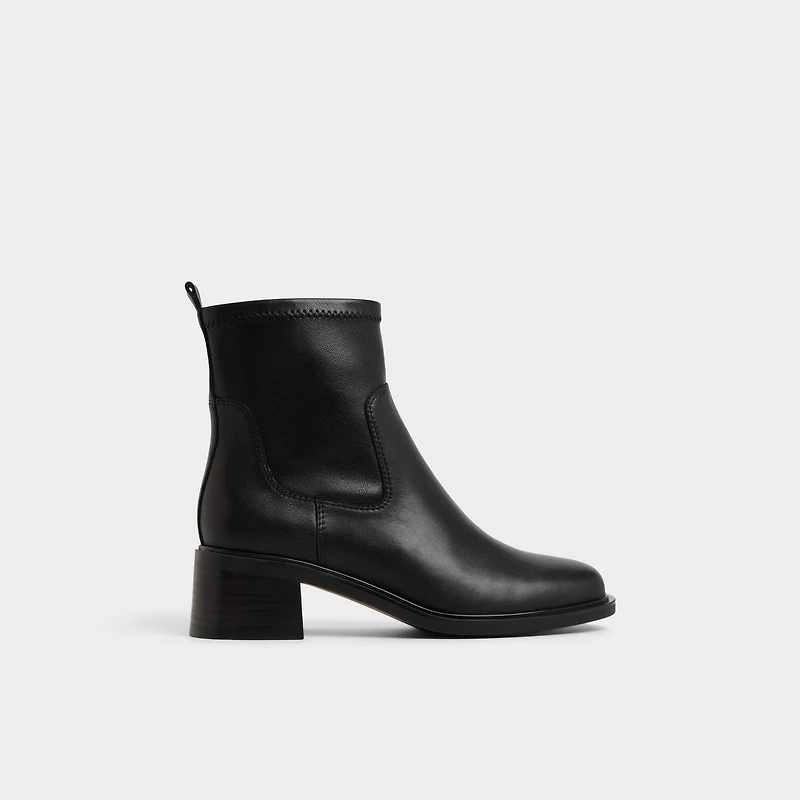 Du cuir noir souple sculpte une botte élégante et épurée, où des panneaux extensibles rencontrent un talon bloc sculpté offrant un rythme confortable toute la journée et une silhouette discrètement élégante à associer avec des tenues habillées ou du denim. Portez-la avec des pantalons ajustés pour le bureau, ou associez-la à des mini-jupes fleuries pour des week-ends de galeries et des promenades urbaines décontractées.