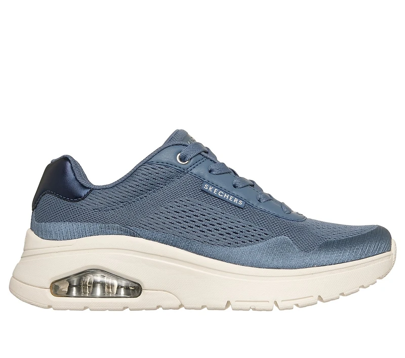 Elevate each step with air-cushioned comfort in Skechers Street™: UNO Flex - Elevatin'. This fashion style features a mesh, satin Lycra, and hotmelt overlay upper with a lace-up front, a cushioned Skechers Memory Foam™ insole, and a visible Skech-Air® airbag midsole.
