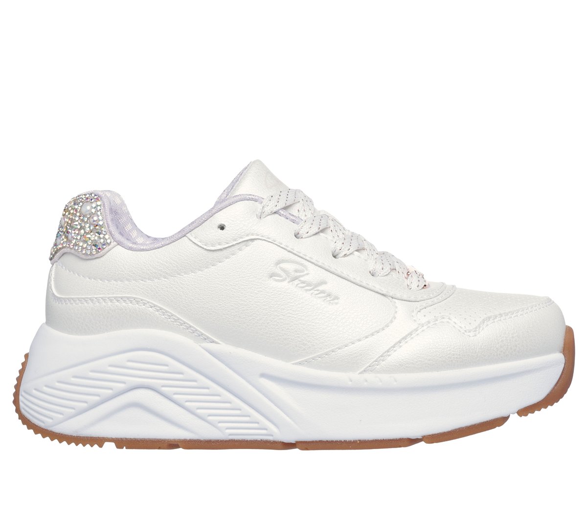 Style urbain et confort hors pair caractérisent la chaussure Skechers Street™ Uno Lite HI. Cette chaussure à la mode avec lacets comprend une empeigne en matériau synthétique, un talon orné de bijoux, une semelle intérieure Skechers Air-Cooled Memory Foam™ confortable et une semelle intercalaire amortissante à plateforme.