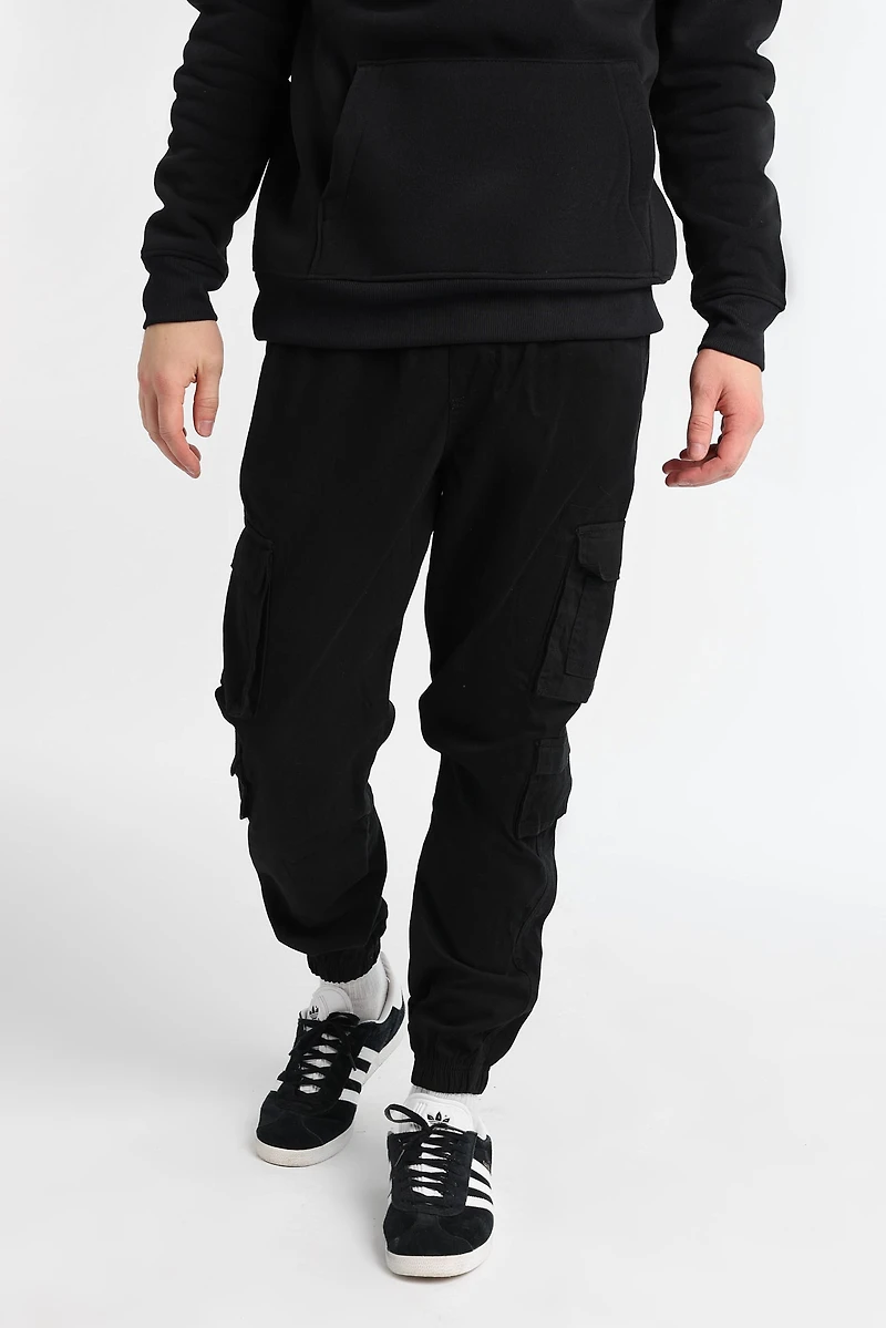 Stretch twillRelaxed fit2 side slanted pockets, 2 back pockets, 2 cargo pockets, 2 utility pocketsElastic waistband with drawstringFaux flyElastic leg cuffs98% Cotton, 2% SpandexMachine wash inside out in cold water - Gentle with like colours - No bleach - Tumble dry low - Low ironImportedStyle #0614-39662608
