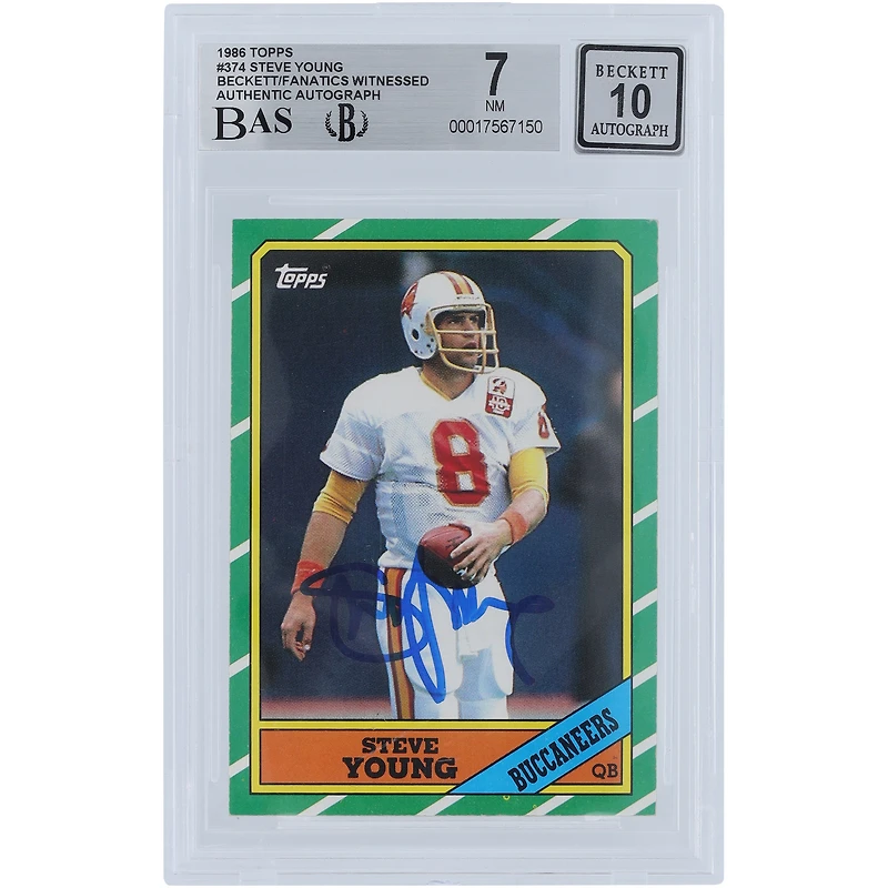 Add to your NFL collection with this Steve Young Tampa Bay Buccaneers Autographed 1986 Topps #374 Beckett Fanatics Witnessed Authenticated 7/10 Rookie Card. Graded 7 and authenticated, this card is the perfect way to celebrate the career and accomplishments of the legendary quarterback. Along with an eye-catching design and his unmistakable signature, it's encapsulated in a tamper-evident case for a lasting display of your Steve Young fandom.