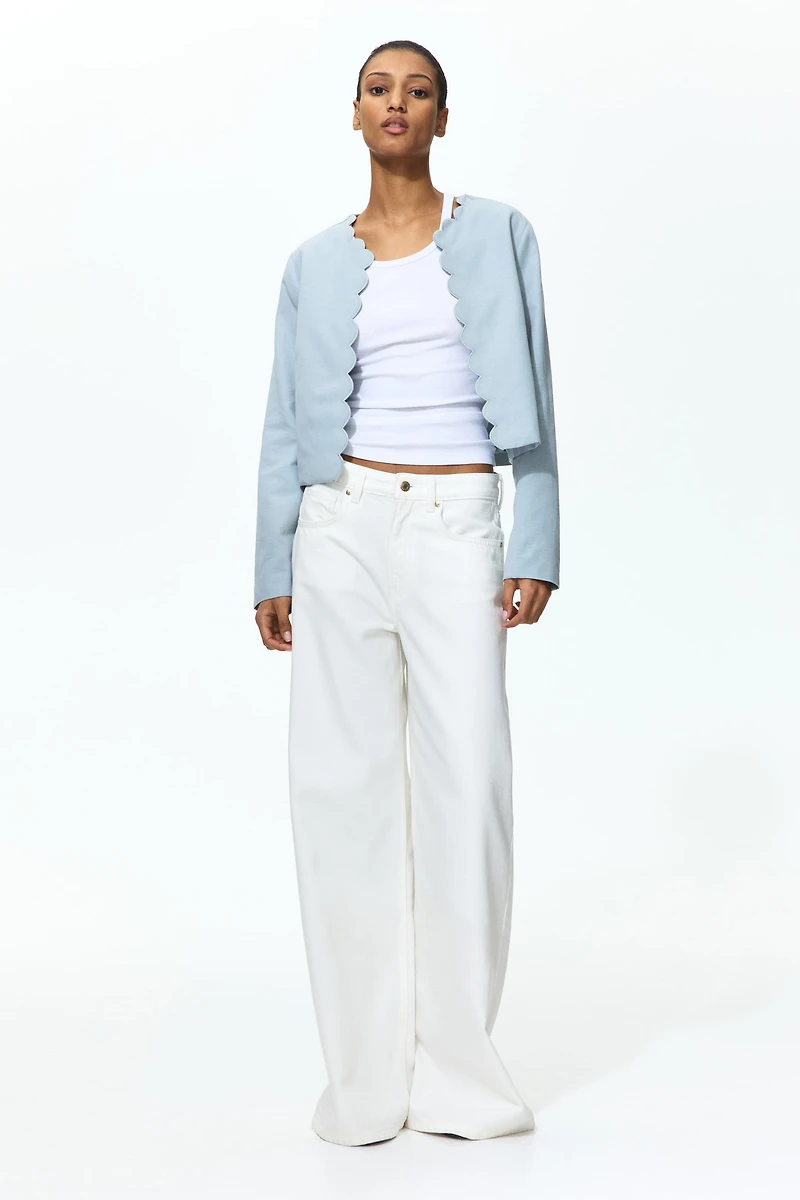 Veste sans boutonnage en matière tissée. Modèle à bord festonné autour de l'encolure ronde et le long de l'ouverture devant. Doublée.