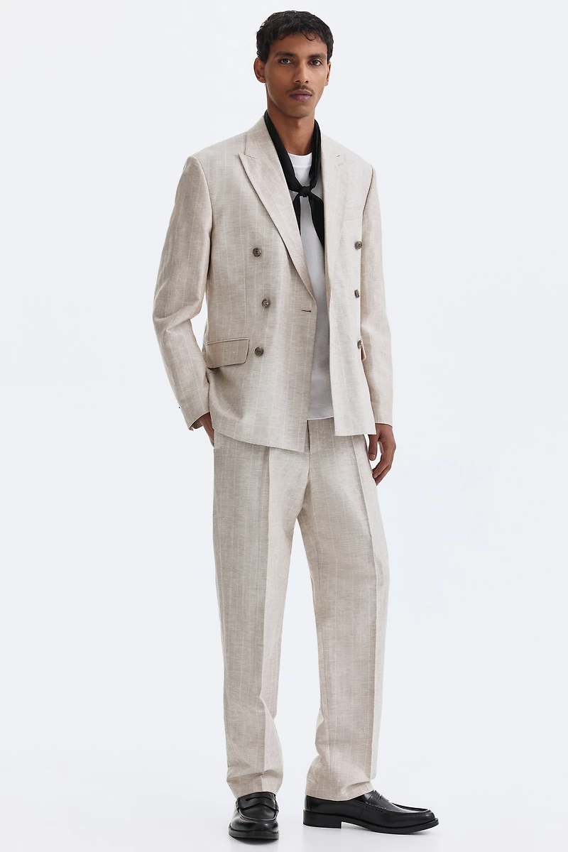 Veste en tissu souple à double boutonnage. Modèle avec col à revers en pointe et fermeture croisée devant. Boutons décoratifs en bas de manche. Poche de poitrine et poches à rabat devant. Deux fentes au dos. Deux poches intérieures passepoilées. Coupe classique pour une silhouette classique et un plus grand confort. Partiellement doublée.