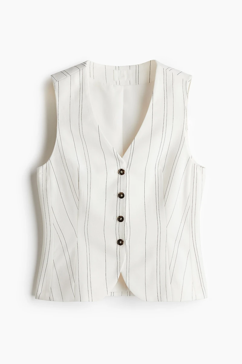 Gilet sans manches en matière tissée. Modèle avec encolure en V et boutonnage devant. Pinces devant pour une silhouette flatteuse. Doublé.