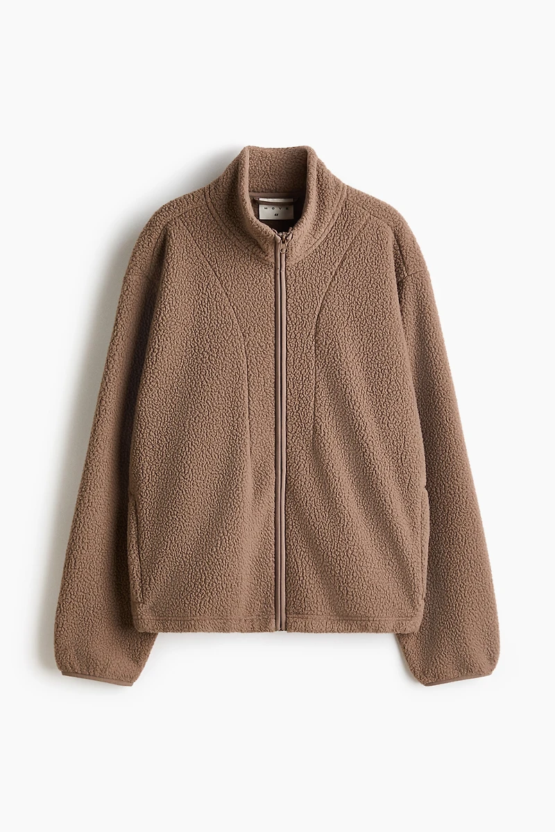 Veste de sport en polar doux et chaud. Coupe flottante avec col droit et fermeture éclair devant. Manches longues terminées par petit élastique. Poche raglan à fermeture éclair de chaque côté et bas resserrable par cordon élastique dissimulé avec arrêts. Non doublée.