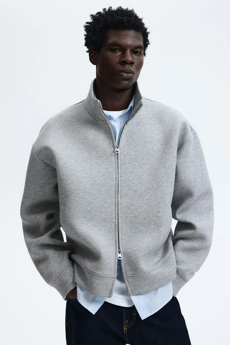 Veste de survêtement en scuba souple. Modèle à col droit avec emmanchures descendues et fermeture éclair double curseur dissimulée devant. Poche raglan de chaque côté. Large ourlet côtelé aux poignets et au bas. Coupe flottante qui offre de l'ampleur sans être trop grande.