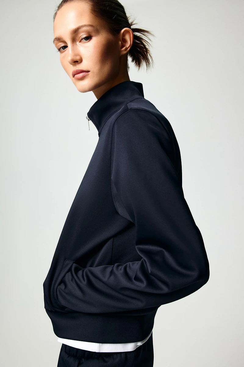 Veste de survêtement courte en jersey épais à l'aspect légèrement satiné. Modèle à col droit et fermeture éclair devant. Poche raglan de chaque côté.
