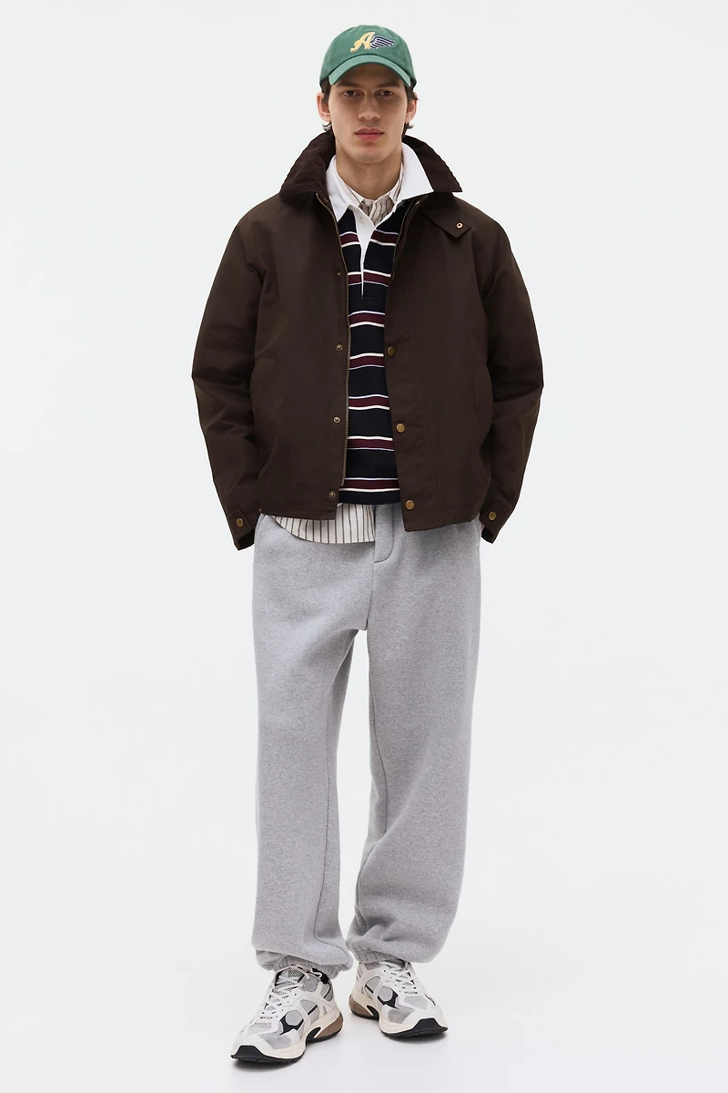 Veste de travail en matière tissée. Modèle à col rabattu en velours de coton doux et côtelé, muni d'une sous-gorge, rabat coupe-vent à pression et fermeture éclair devant. Manches terminées par patte à pression ajustable au niveau du poignet. Poche raglan de chaque côté. Doublure en coton.