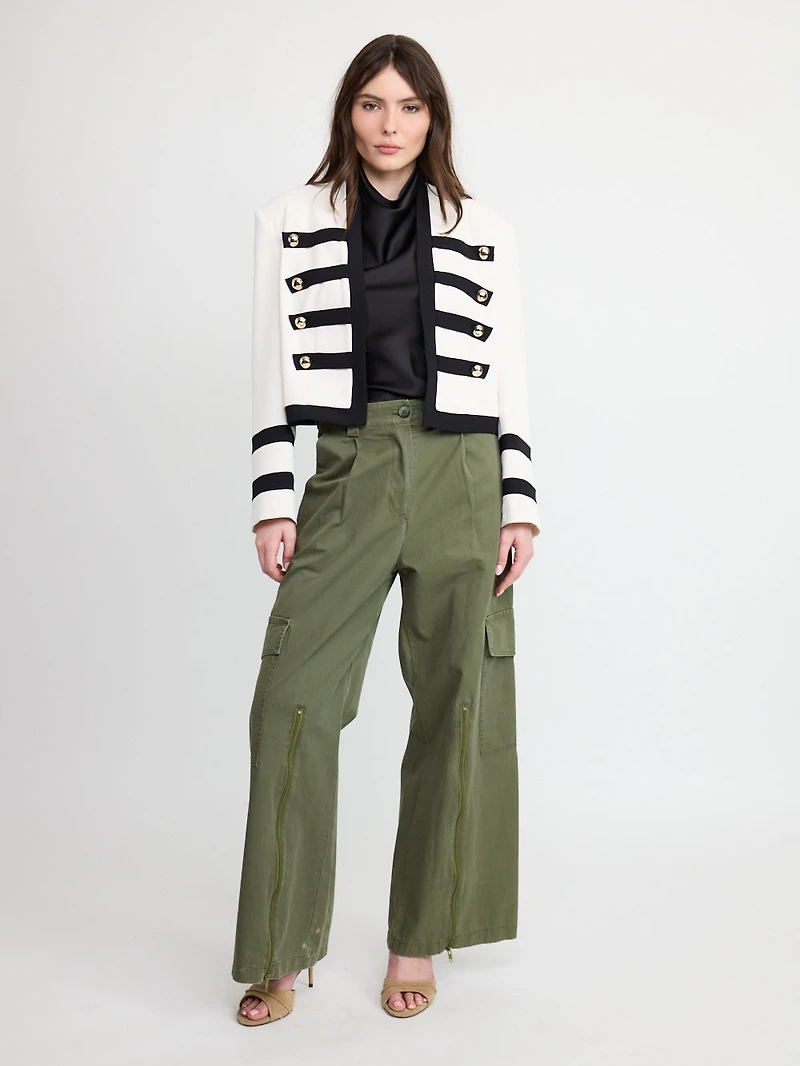 Elevate your urban wardrobe with this striking short jacket, featuring metallic buttons set against bold contrasting bands that wrap across the torso and sleeves. The crisp, geometric cut delivers a contemporary silhouette with refined graphic appeal. Versatile enough to anchor any signature look, this piece brings polished sophistication to everyday styling.