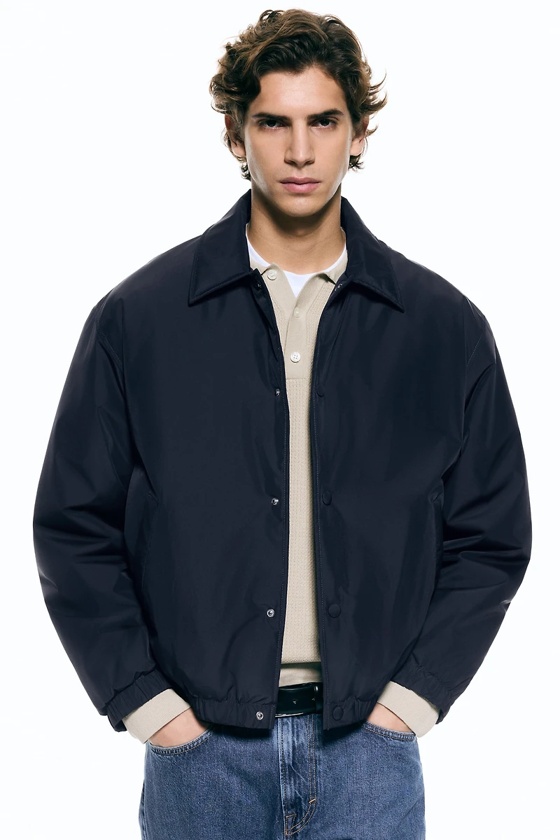 Veste en tissu légèrement matelassé. Modèle à manches longues avec col rabattu et fermeture par boutons-pression devant. Poches raglan devant. Élastique habillé aux poignets et au bas. Une poche raglan à l'intérieur. Doublure matelassée.