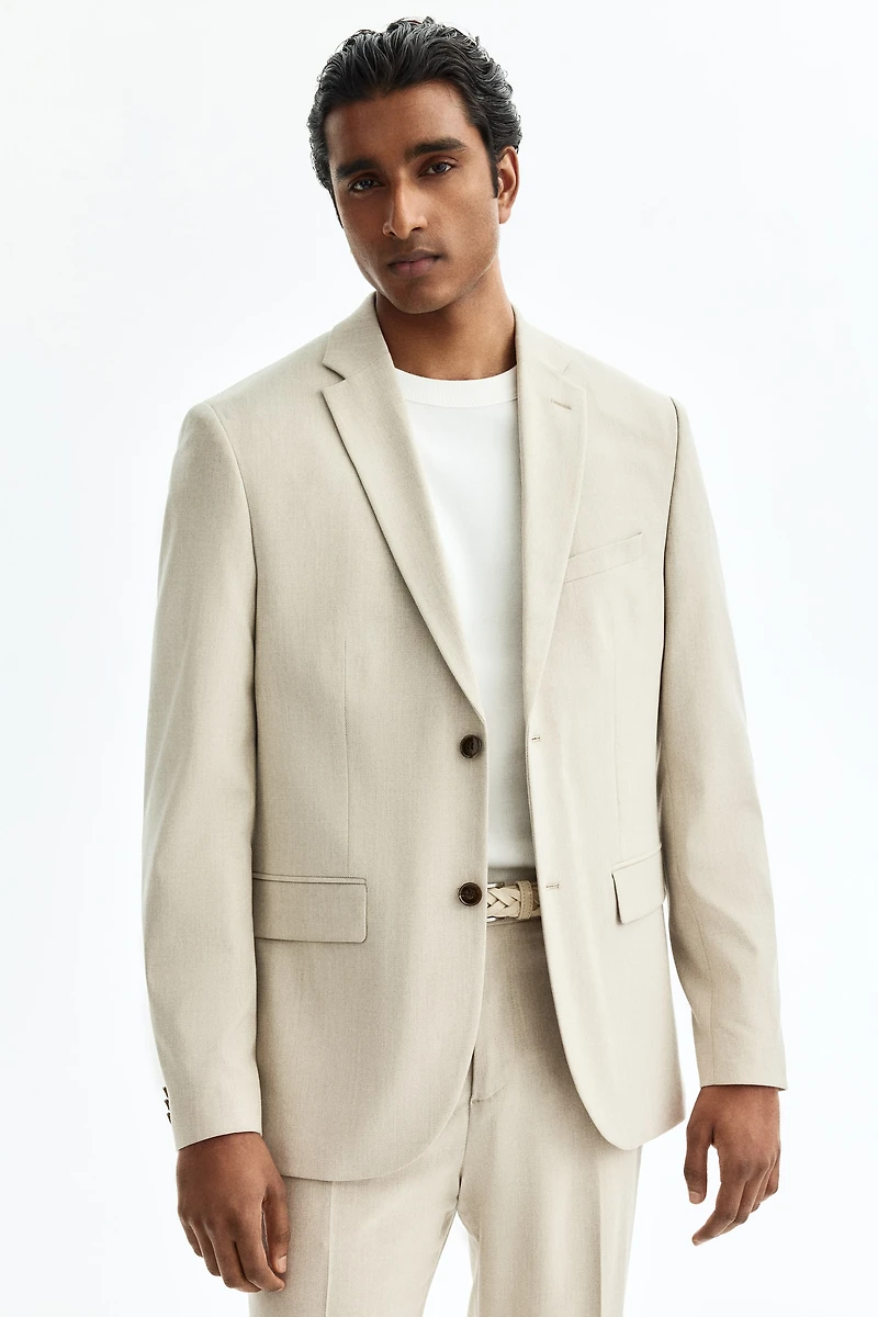 Veste en tissu souple enrichi d'une touche de laine. Modèle avec col à petits revers crantés, agrémenté d'une boutonnière décorative, et fermeture droite au moyen de deux boutons devant. Boutons décoratifs en bas de manche. Poche raglan sur la poitrine et poches à rabat devant. Deux fentes dans le dos. Trois poches intérieures. Coupe près du corps qui épouse la silhouette et met le corps en valeur. Doublée.