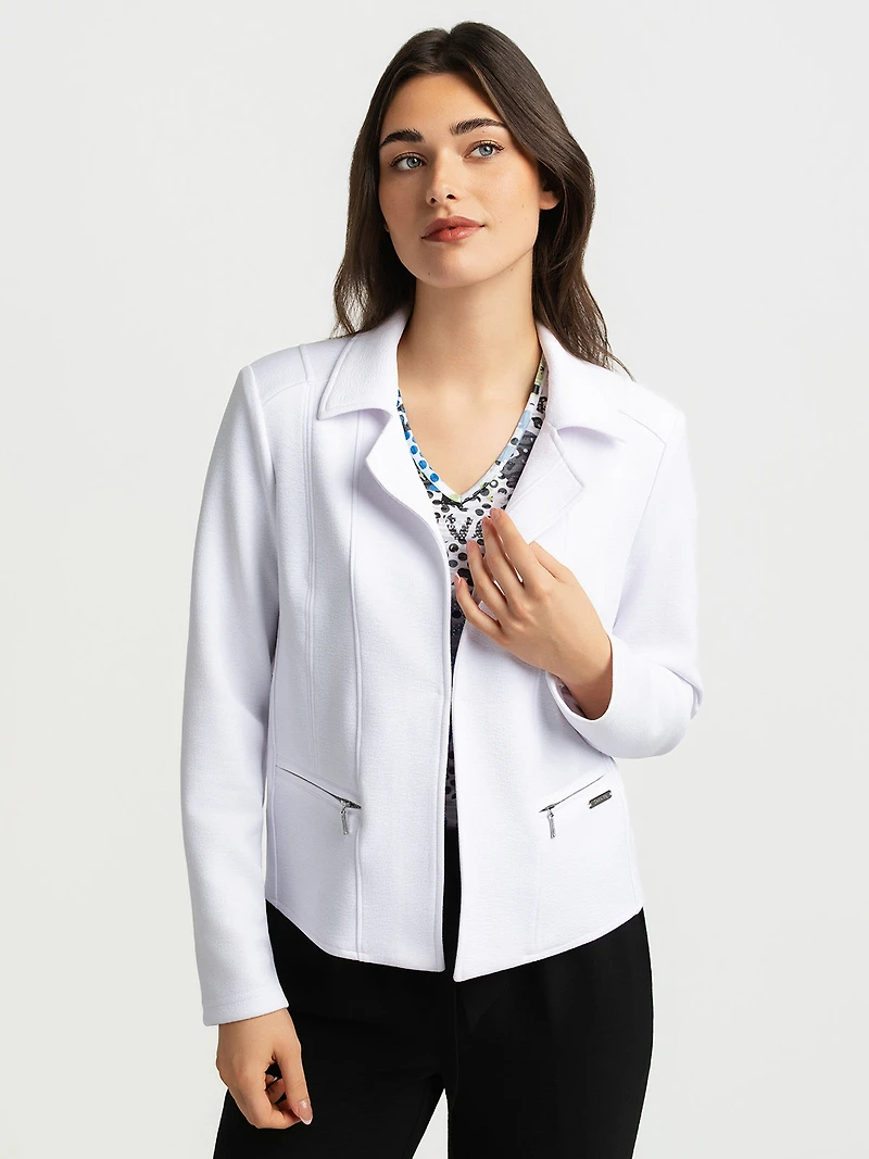 Veston court avec col tailleur et ouverture frontale sans fermeture. Le modèle présente des manches longues, une coupe ajustée et deux poches latérales zippées.