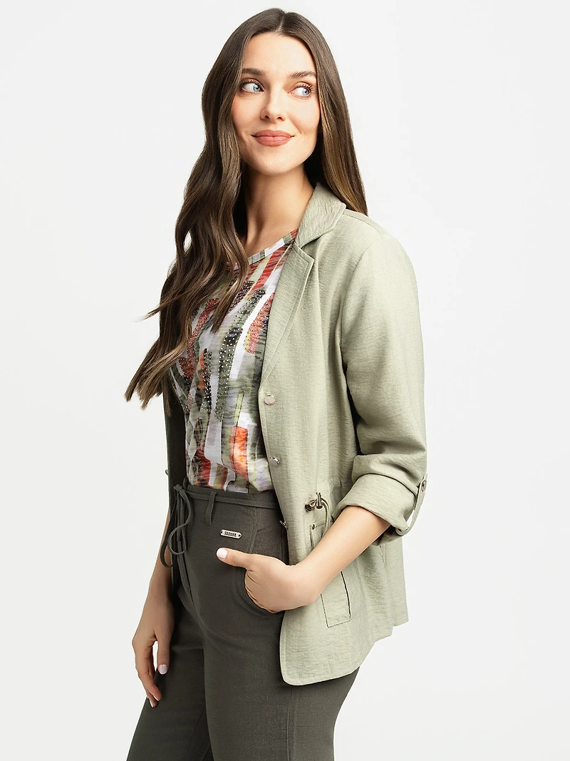 Veston à manches longues avec col tailleur. Le modèle comporte une fermeture frontale par boutons, un lien de serrage ajustable à la taille et deux poches plaquées à rabat sur le devant.