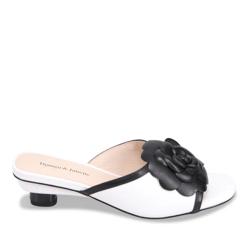Apportez une touche d’élégance audacieuse à votre style avec ces mules noires à petit talon. Leur silhouette moderne est sublimée par un liseré blanc contrastant et une fleur oversize en cuir qui attire instantanément le regard.
