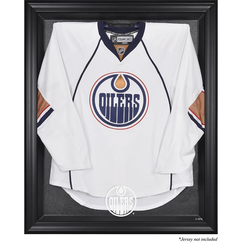 Vitrine de présentation avec cadre noir pour maillot des Oilers d'Edmonton
