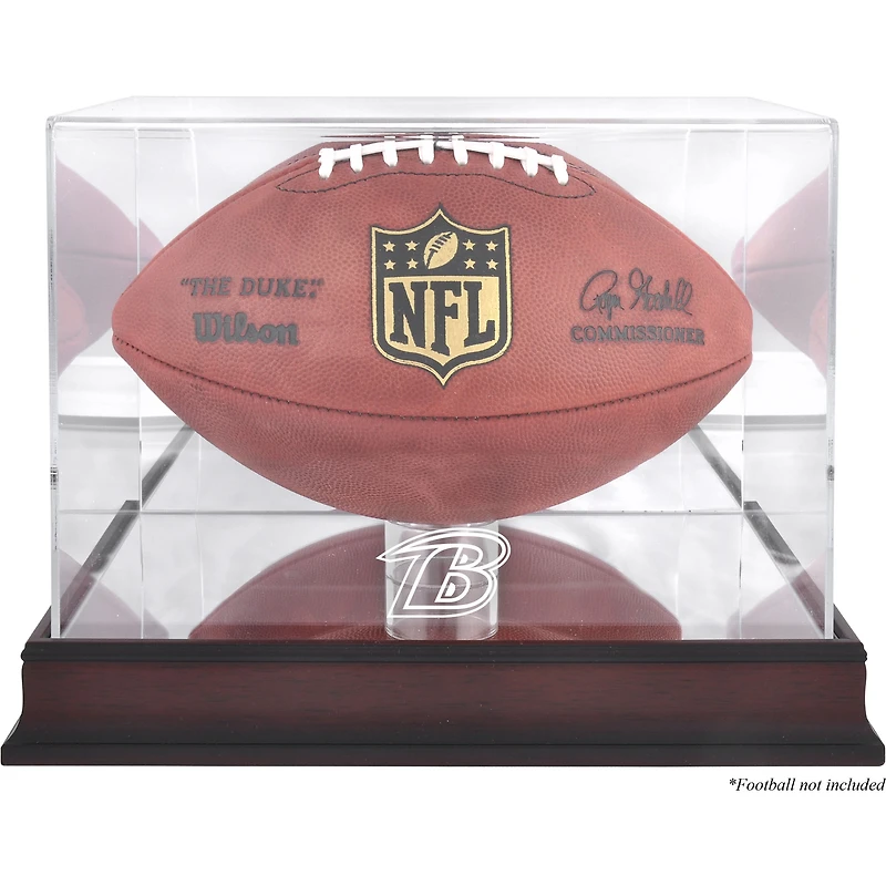 La vitrine de présentation du logo de football des Baltimore Ravens en acajou antique est dotée d'un couvercle amovible en acrylique transparent de 1/8" d'épaisseur avec le logo de l'équipe gravé. Il est également livré avec une base au fini acajou antique avec un fond et un dos en miroir. Parfait pour un ballon de football de collection. Sous licence officielle de la National Football League. Dimensions intérieures : 12 1/4" x 8 1/2" x 8". Dimensions extérieures : 13 1/4" x 9 1/2" x 10". Souvenirs vendus séparément.