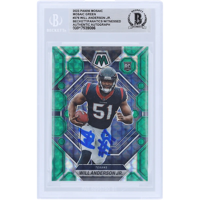 Add a unique piece of memorabilia to your Houston Texans collection with this Will Anderson Jr. Autographed 2023 Panini Mosaic Green #376 Beckett Fanatics Witnessed Authenticated Rookie Card. This colorfully designed card showcases Anderson Jr. including a hand-signed autograph authenticated by Beckett and Fanatics. Encapsulated in a tamper-proof acrylic case ensuring its protection and preservation, this rookie card is a great choice to add to your fandom or memorabilia collection.