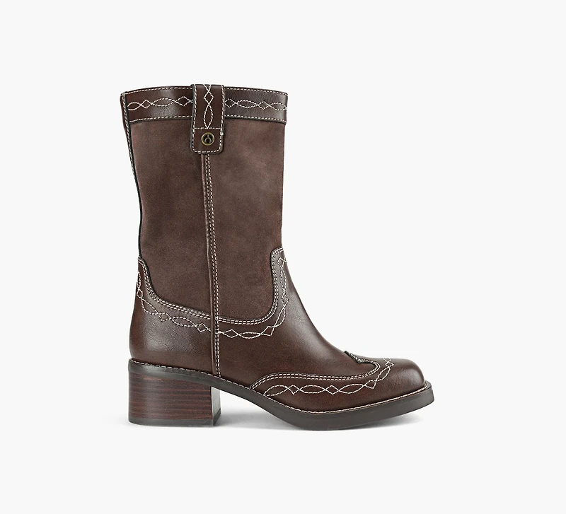 La Wilma par WISHBONE, une silhouette western intemporelle. Rehaussée de délicates coutures et de son talon bottier, des tirants aux côtés propose un design facile à enfiler.