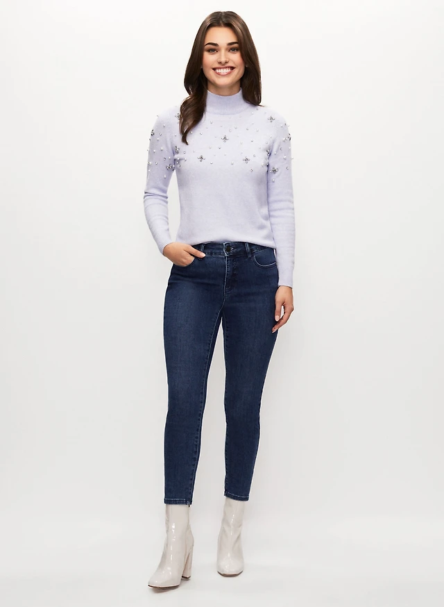 Pull à perles et cristaux et jean bleu étroit